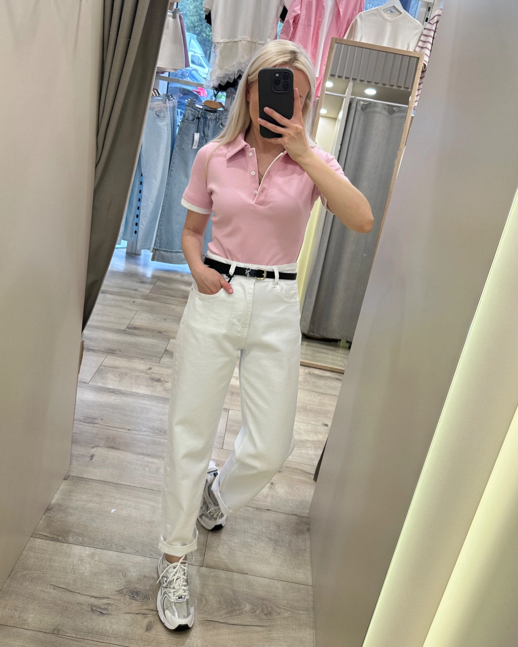 Блакитні джинси з акцентним ніжно-рожевим поясом