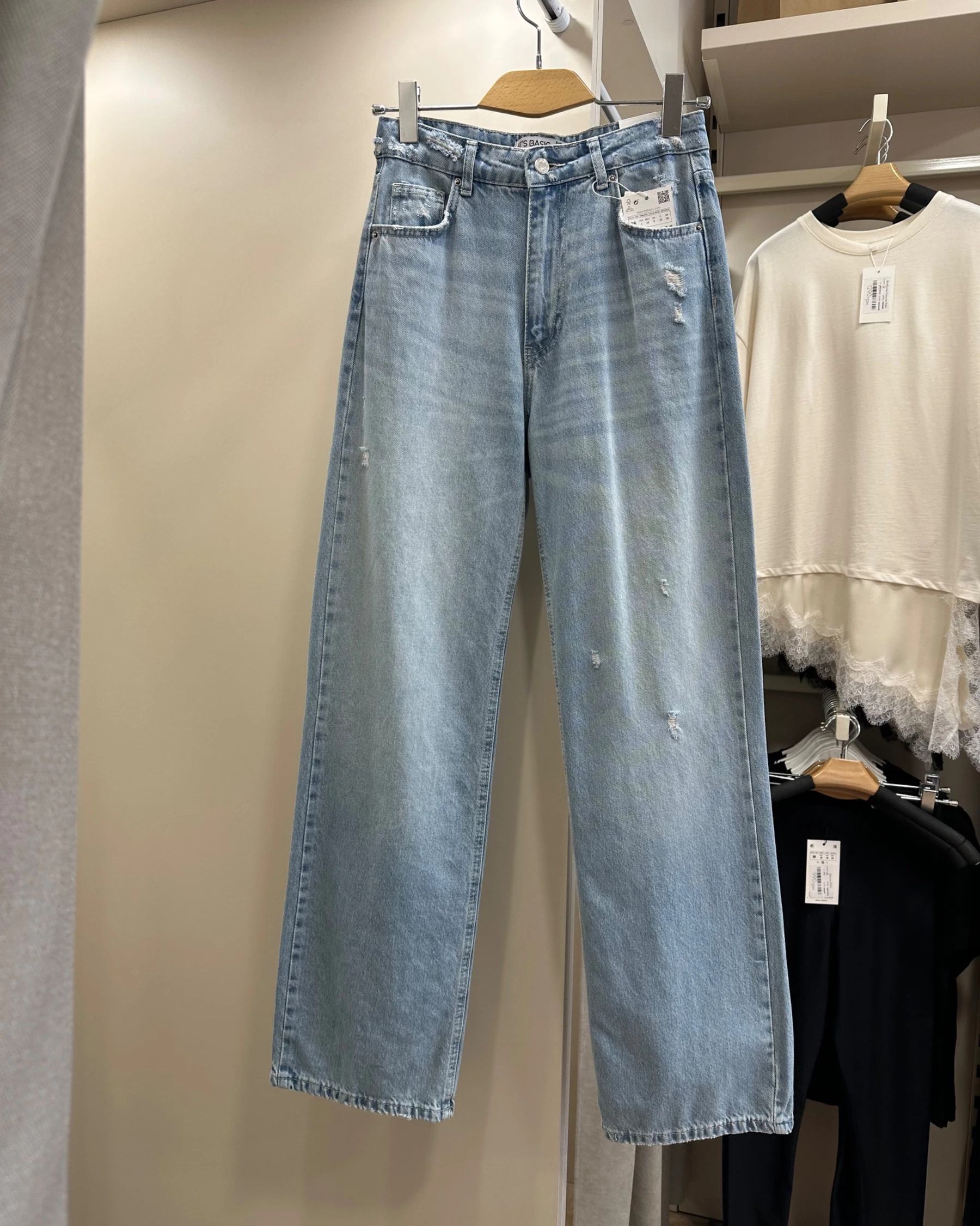 Прямі блакитні джинси з потертостями